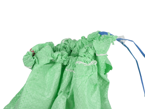 Worek wykonany z tkanych tasiemek polipropylenowych.